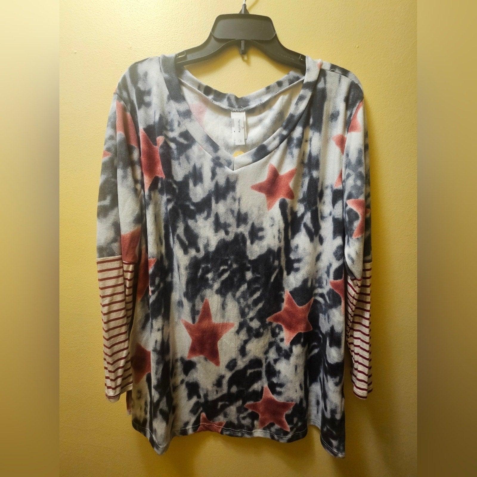 Eye-catching blouse with tie-dye design and bold red stars. Features striped sleeves for added style.