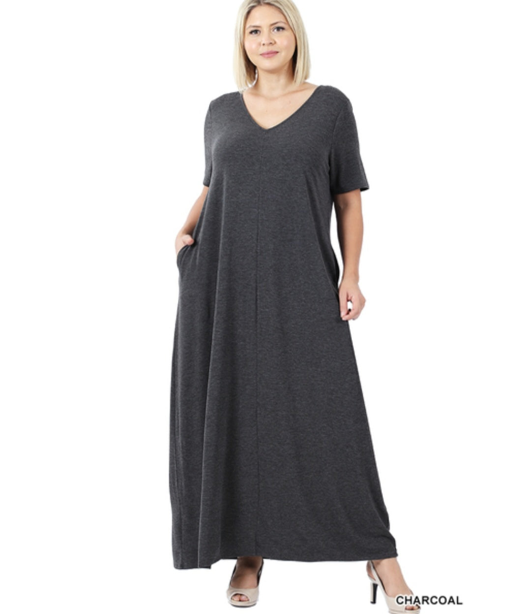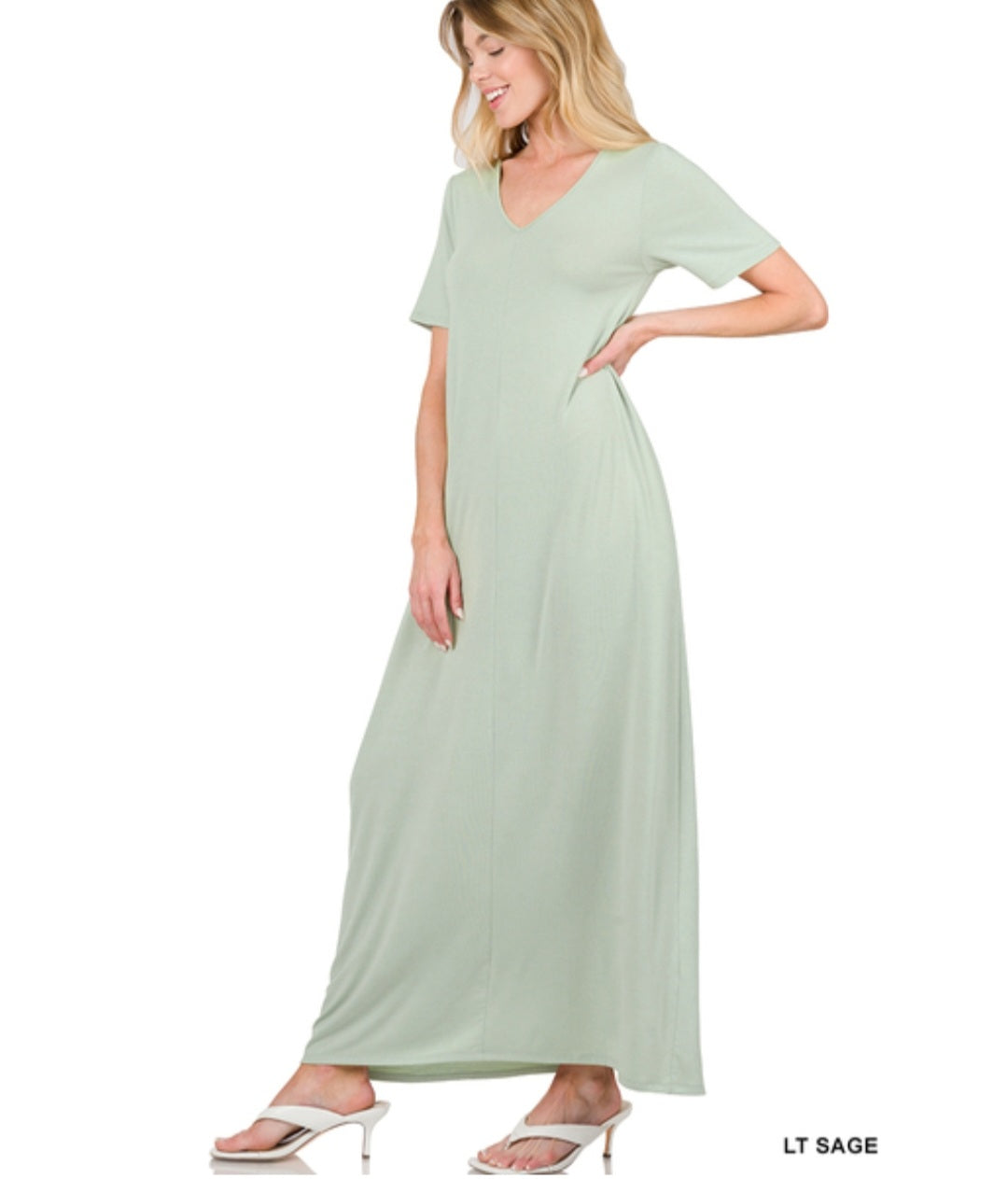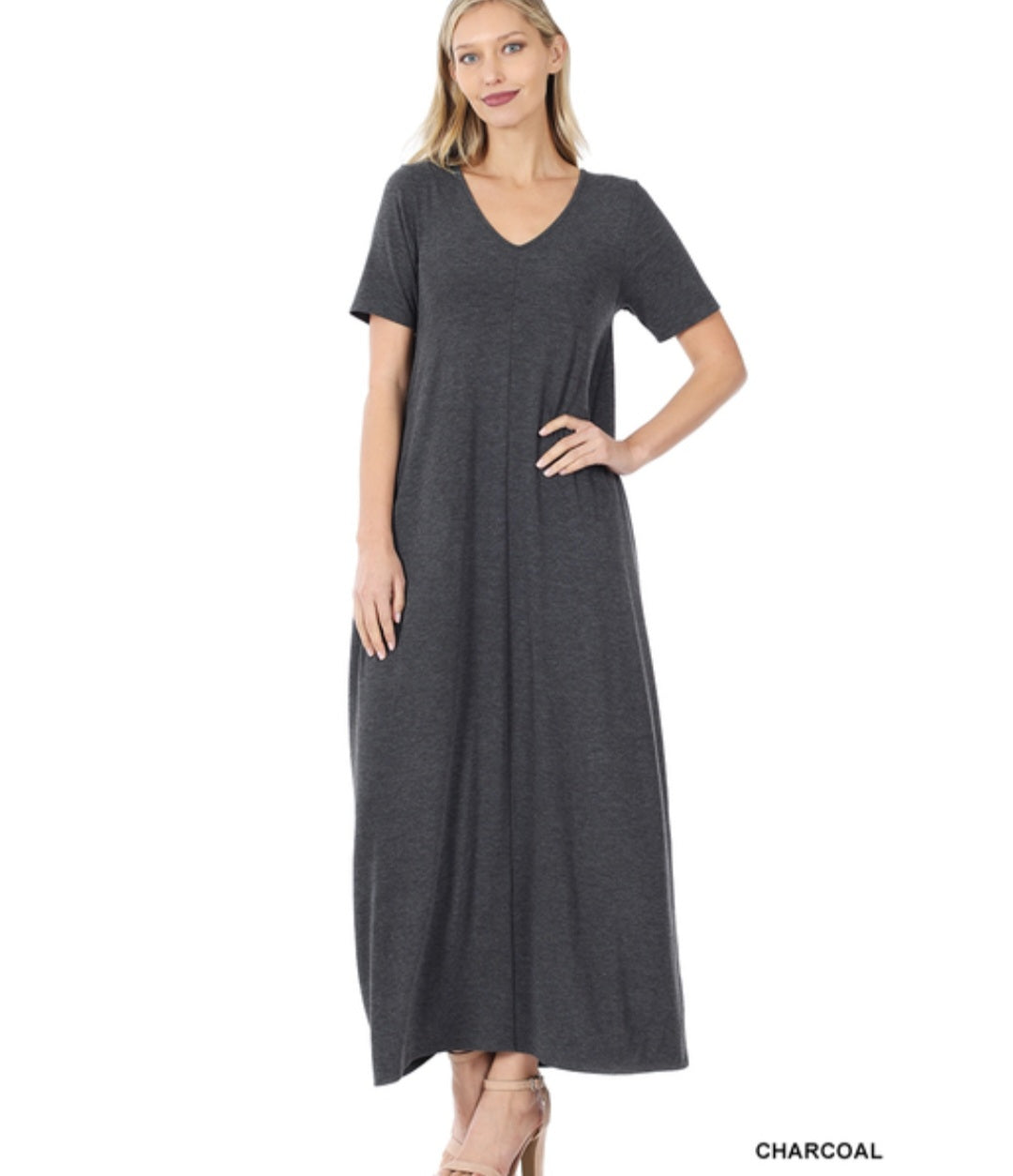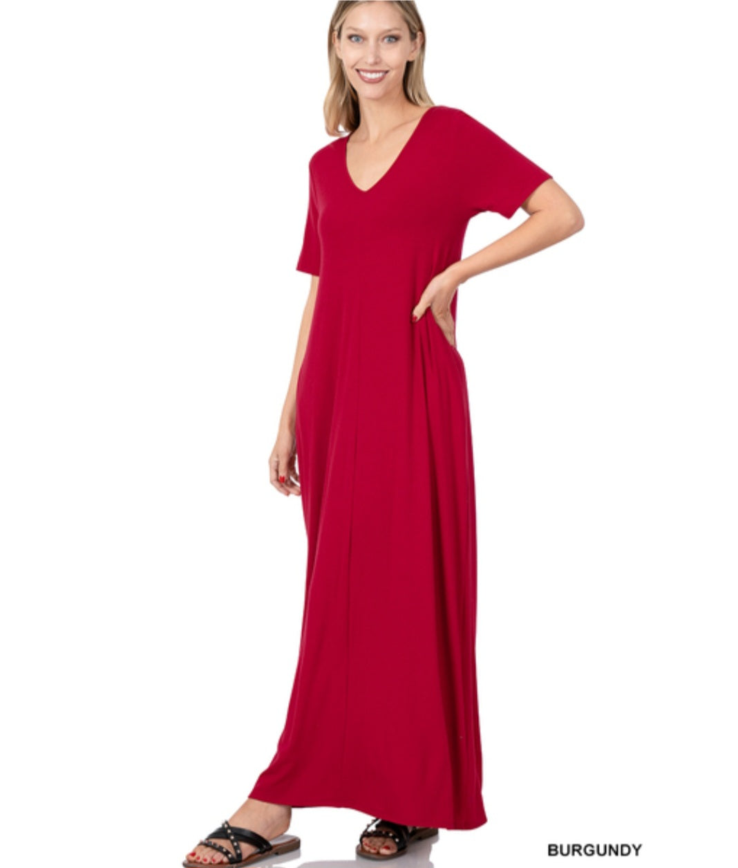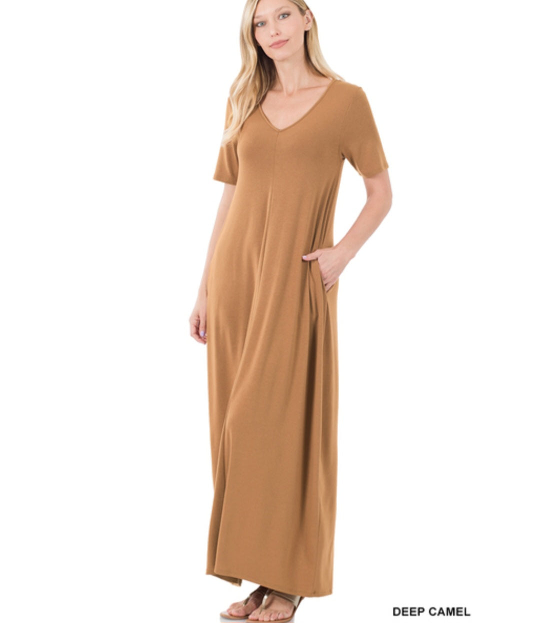 V-NECK SHORT SLEEVE MAXI DRESS WITH SIDE POCKETS
